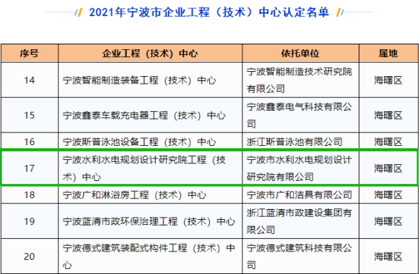 發(fā)布日期:2022.09.15 近日,寧波市發(fā)展和改革委員會、寧波市經(jīng)濟和信息化局、寧波市財政局、寧波市科學(xué)技術(shù)局聯(lián)合發(fā)文,公布2021年寧波市企業(yè)工程(技術(shù))中心認定名單。我院為主體申報的“寧波水利水電... -