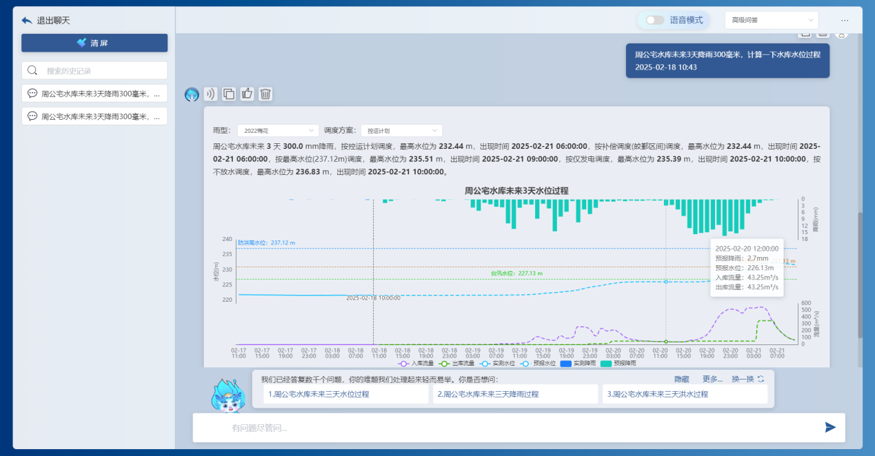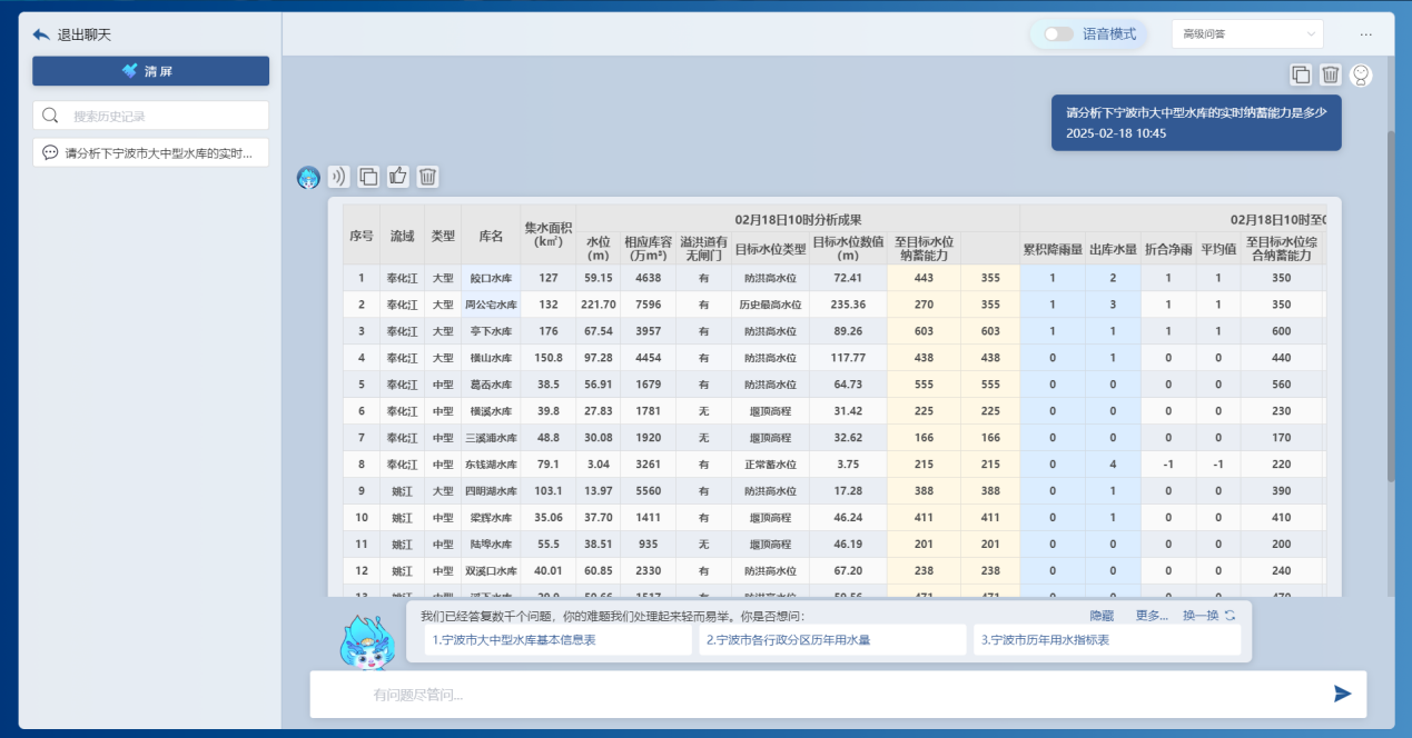 基于前端感知的降雨、水位、流量、工程運(yùn)行等實(shí)時(shí)信息,借助DeepSeek大模型和“甬水院智算”算法庫(kù),能夠?qū)崟r(shí)對(duì)流域防汛形勢(shì)進(jìn)行快速分析,包括降雨形勢(shì)、水情預(yù)警、預(yù)泄分析、水庫(kù)納蓄分析等,可以按照規(guī)定的表單形式一鍵輸出成果,為防汛防洪工作提供兼具前瞻性、科學(xué)性、精準(zhǔn)性、安全性的決策支撐。相關(guān)學(xué)術(shù)成果曾以《基于大模型的水利防汛智能問(wèn)答關(guān)鍵技術(shù)研究與應(yīng)用探索》為題于去年8月的第七屆城市水安全與水管理學(xué)術(shù)交流會(huì)作專(zhuān)題匯報(bào)。