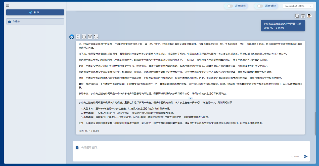 基于本地部署的DeepSeek-r1模型和私域知識(shí)庫(kù),通過(guò)該工具能夠?qū)崿F(xiàn)對(duì)水利行業(yè)的水旱災(zāi)害防御、水資源管理、水工程管理、水生態(tài)保護(hù)等各領(lǐng)域知識(shí)的高效檢索問(wèn)答,節(jié)省大量查閱資料的時(shí)間,提高工作效率。