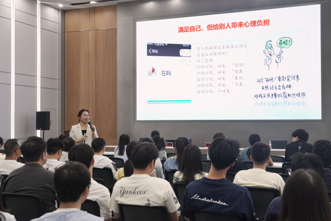 陳瑛老師的講座圍繞自我激勵(lì)、協(xié)同溝通、對外溝通、對上溝通四大維度展開。首先,陳瑛老師分別以工作場景和生活場景中的溝通對話與大家進(jìn)行互動(dòng),帶領(lǐng)大家對“高情商”進(jìn)行思考與剖析,由此展開當(dāng)天的主題。隨后,結(jié)合豐富的實(shí)戰(zhàn)案例與互動(dòng)環(huán)節(jié),陳瑛老師層層遞進(jìn),深入淺出地講解了如何在日常工作中實(shí)現(xiàn)高效溝通,激發(fā)自我驅(qū)動(dòng)力,提升團(tuán)隊(duì)協(xié)同效能。在長達(dá)2.5小時(shí)的課程中,陳瑛老師還結(jié)合商務(wù)禮儀的要點(diǎn),根據(jù)不同場景對溝通實(shí)操進(jìn)行了解析。并強(qiáng)調(diào),良好的溝通不僅是技巧,更是一種心態(tài)與習(xí)慣的培養(yǎng),也是實(shí)現(xiàn)個(gè)人與團(tuán)隊(duì)實(shí)現(xiàn)共同成長的重要途徑。