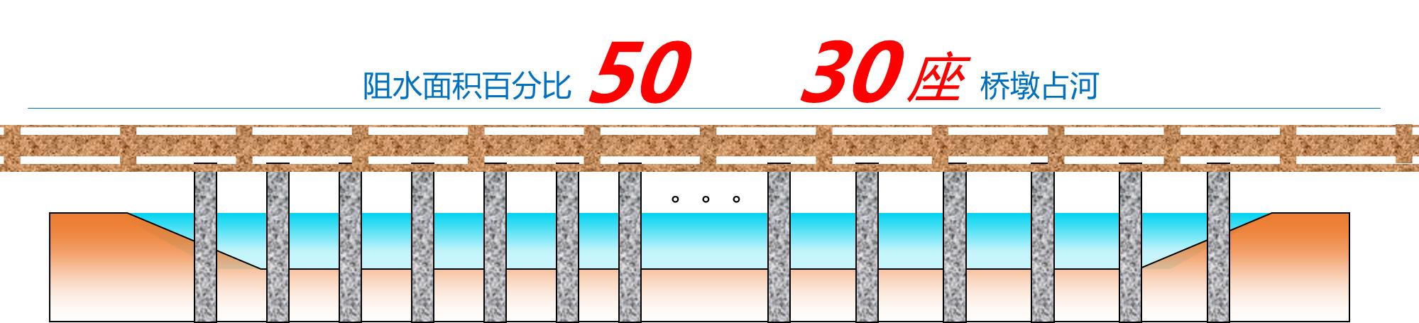 根據(jù)原設(shè)計,共有30座橋墩占用河道, 20年一遇設(shè)計水位條件下,橋墩阻水面積百分比達(dá)到50%以上,不符合《浙江省涉河橋梁水利技術(shù)規(guī)定》關(guān)于“跨越III級及以下堤防以及無堤防河道的橋梁的阻水面積百分比不宜大于6%,不得超過8%。”的要求