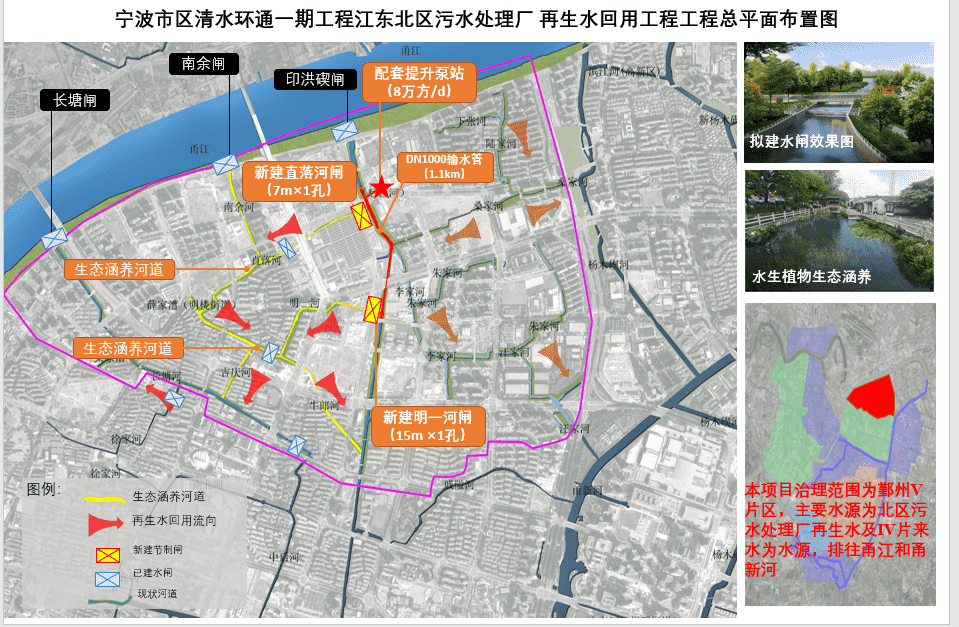 寧波市區(qū)清水環(huán)通一期工程江東北區(qū)污水處理廠再生水回用工程為增加河網(wǎng)水環(huán)境用水量,提升河網(wǎng)水體透明度及水體質(zhì)量,配套新建廠內(nèi)泵站1座,新建河道攔河鋼壩2座,新建再生水回用管道約1.1km,管道直徑約DN1000。水泵加壓后,通過引水管道將廠內(nèi)的水引至廠區(qū)外,與廠外的的輸水管道相接,管道沿后西河布置,并在直落河與明一河中設(shè)置兩個排口,出口各設(shè)置一座閥門井及一座攔河鋼壩。同時在直落河排口下游、明一河排口下游新建生態(tài)水源涵養(yǎng)區(qū)4.9km,配套岸線修復(fù)若干。